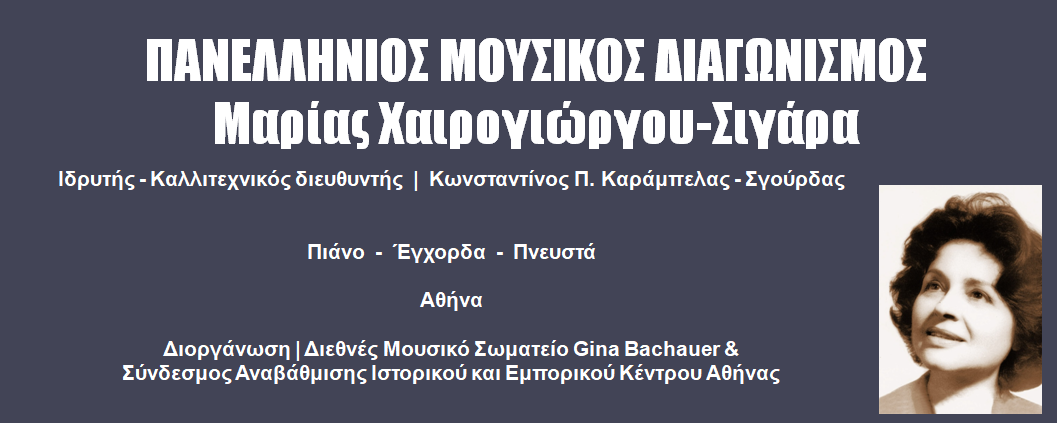 Ο τελικός κύκλος του Πανελλήνιου Μουσικού Διαγωνισμού Μαρίας Χαιρογιώργου Σιγάρα (κατηγορίες Α, Β, Γ και Δ) και ο Διαγωνισμός για το «ΒΡΑΒΕΙΟ ΝΕΟΥ ΣΟΛΙΣΤ ΜΑΡΙΑΣ ΧΑΙΡΟΓΙΩΡΓΟΥ-ΣΙΓΑΡΑ» (ένας κύκλος) και για το «ΜΕΓΑΛΟ ΒΡΑΒΕΙΟ ΣΟΛΙΣΤ ΜΑΡΙΑΣ ΧΑΙΡΟΓΙΩΡΓΟΥ-ΣΙΓΑΡΑ» (ένας κύκλος), θα πραγματοποιηθούν στην Αίθουσα Γιάννης Μαρίνος (πρώην Πολυχώρος) της Μουσικής Βιβλιοθήκης του Συλλόγου «Οι Φίλοι της Μουσικής», στο ΜΕΓΑΡΟ ΜΟΥΣΙΚΗΣ ΑΘΗΝΩΝ, το Σάββατο 4 Απριλίου 2026.