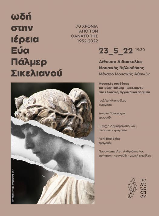 Το Καλλιτεχνικό Σύνολο «Πολύτροπον» (υπεύθυνος: Παναγιώτης Αντ. Ανδριόπουλος) παρουσιάζει ένα αφιέρωμα στην ιέρεια του Ελληνικού πολιτισμού Εύα Πάλμερ – Σικελιανού, με αφορμή τα 70 χρόνια από τον θάνατό της, τη Δευτέρα 23 Μαΐου 2022 στις 7.30 μ.μ. στην Αίθουσα Διδασκαλίας της Μουσικής Βιβλιοθήκης, στο Μέγαρο Μουσικής Αθηνών.