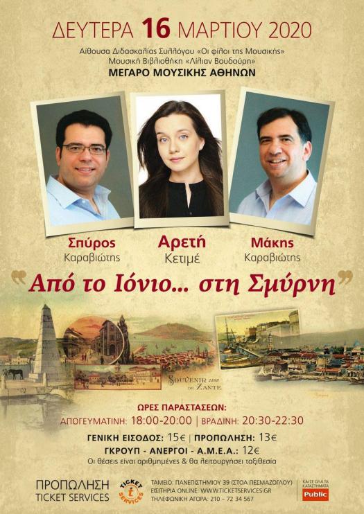Τη Δευτέρα 16 Μαρτίου 2020 στην Αίθουσα Διδασκαλίας της Μουσικής Βιβλιοθήκης «Λίλιαν Βουδούρη» στο Μέγαρο Μουσικής Αθηνών (Βασιλίσσης Σοφίας & Κόκκαλη) οι τραγουδιστές της αγάπης, Σπύρος & Μάκης Καραβιώτης, ενώνουν τις φωνές τους με την υπέροχη Αρετή Κετιμέ παρουσιάζοντας από κοινού μια μοναδική συναυλία με τίτλο: «Από το Ιόνιο... στη Σμύρνη»