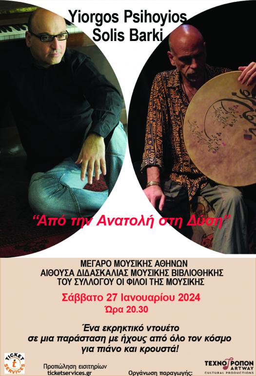 O σημαντικός συνθέτης και σολίστας Γιώργος Ψυχογιός στο πιάνο και ο εντυπωσιακός και πολυσχιδής Σόλης Μπαρκί στα κρουστά, θα βρεθούν μαζί επί σκηνής στην Αίθουσα Διδασκαλίας της Μουσικής Βιβλιοθήκης, στο Μέγαρο Μουσικής Αθηνών, το Σάββατο 27 Ιανουαρίου 2024.