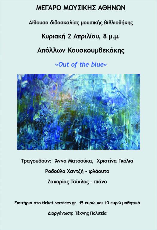 Ο συνθέτης Απόλλων Κουσκουμβεκάκης έρχεται την Κυριακή 2 Απριλίου στο Μέγαρο Μουσικής Αθηνών με την παράσταση «Out of the blue».  Με την Άννα Ματσούκα και τη Χριστίνα Γκόλια στο τραγούδι, το Ζαχαρία Τσίχλα στο πιάνο, τη Ροδούλα Χαντζή στο φλάουτο και τον ίδιο στην κιθάρα, θα παρουσιάσουν τα τραγούδια που πολύ αγάπησαν, σΆένα ταξίδι χωρίς σύνορα στις μουσικές του κόσμου.