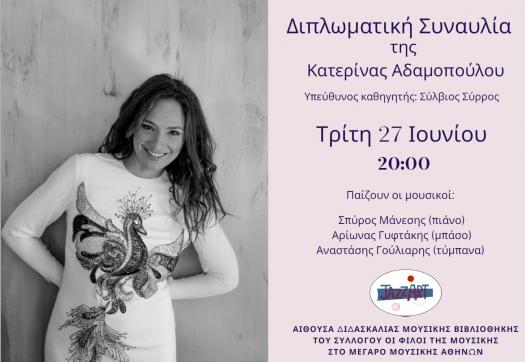 Την Τρίτη 27 Ιουνίου, στις 20:00 θα πραγματοποιηθεί η διπλωματική συναυλία της Κατερίνας Αδαμοπούλου στο Τζαζ τραγούδι, με υπεύθυνο καθηγητή τον Σύλβιο Σύρρο της σχολής Jazzart. Θα ακουστούν κομμάτια από όλο το εύρος των στυλ της Jazz όπως swing, bebop, modal και latin καθώς και πρωτότυπες συνθέσεις. Παίζουν οι μουσικοί: Σπύρος Μάνεσης (πιάνο), Αρίωνας Γυφτάκης (μπάσο) και Αναστάσης Γούλιαρης (τύμπανα). Η συναυλία θα είναι δωρεάν για το κοινό.
