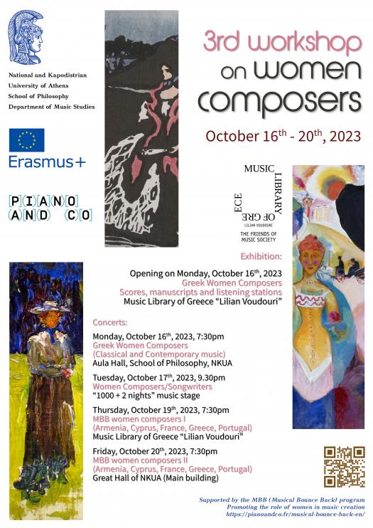 Η έκθεση τεκμηρίων, που συνδιοργανώνεται με την Μουσική Βιβλιοθήκη «Λίλιαν Βουδούρη», εντάσσεται στο εβδομαδιαίο αφιέρωμα (16-20.10.2023) του Τμήματος Μουσικών Σπουδών της Φιλοσοφικής Σχολής του ΕΚΠΑ στις γυναίκες συνθέτριες του 20ού και 21ου αιώνα σε στο πλαίσιο του Ευρωπαϊκού Προγράμματος ERASMUS+ “Musical Bounce Back: Promoting the rοle of women in contemporary creation and education” (https://pianoandco.fr/musical-bounce-back-en/). Στην ΕΒΔΟΜΑΔΑ ΓΥΝΑΙΚΩΝ ΣΥΝΘΕΤΡΙΩΝ (16-20/10/23) διαφορετικών μουσικών ιδιωμάτων (κλασσική, σύγχρονη, ηλεκτρακουστική και δημοφιλή μουσική) συμμετέχουν 40 μουσικοί και 50 συνθέτριες από τα ακαδημαϊκά ιδρύματα 5 χωρών: Ελλάδα, Αρμενία, Πορτογαλία, Κύπρο και Γαλλία. Συντονίστρια του αφιερώματος είναι η Καθηγήτρια Αναστασία Γεωργάκη, Πρόεδρος του Τμήματος Μουσικών Σπουδών ΕΚΠΑ.