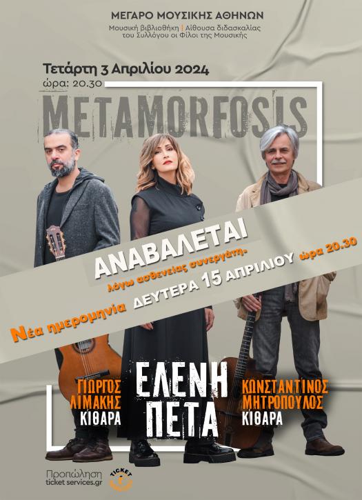 Στην μουσική παράσταση "METAMORFOSIS" συνεργάζεται με τους σολίστες της κιθάρας, Γιώργο Λιμάκη και Κωνσταντίνο Μητρόπουλο, για να μας παρουσιάσουν μια που εύκολα μπορεί να χαρακτηριστεί ως καλλιτεχνική μεταμόρφωση σε διαφορετικούς μουσικούς δρόμους και απρόσμενους μουσικούς συνειρμούς.