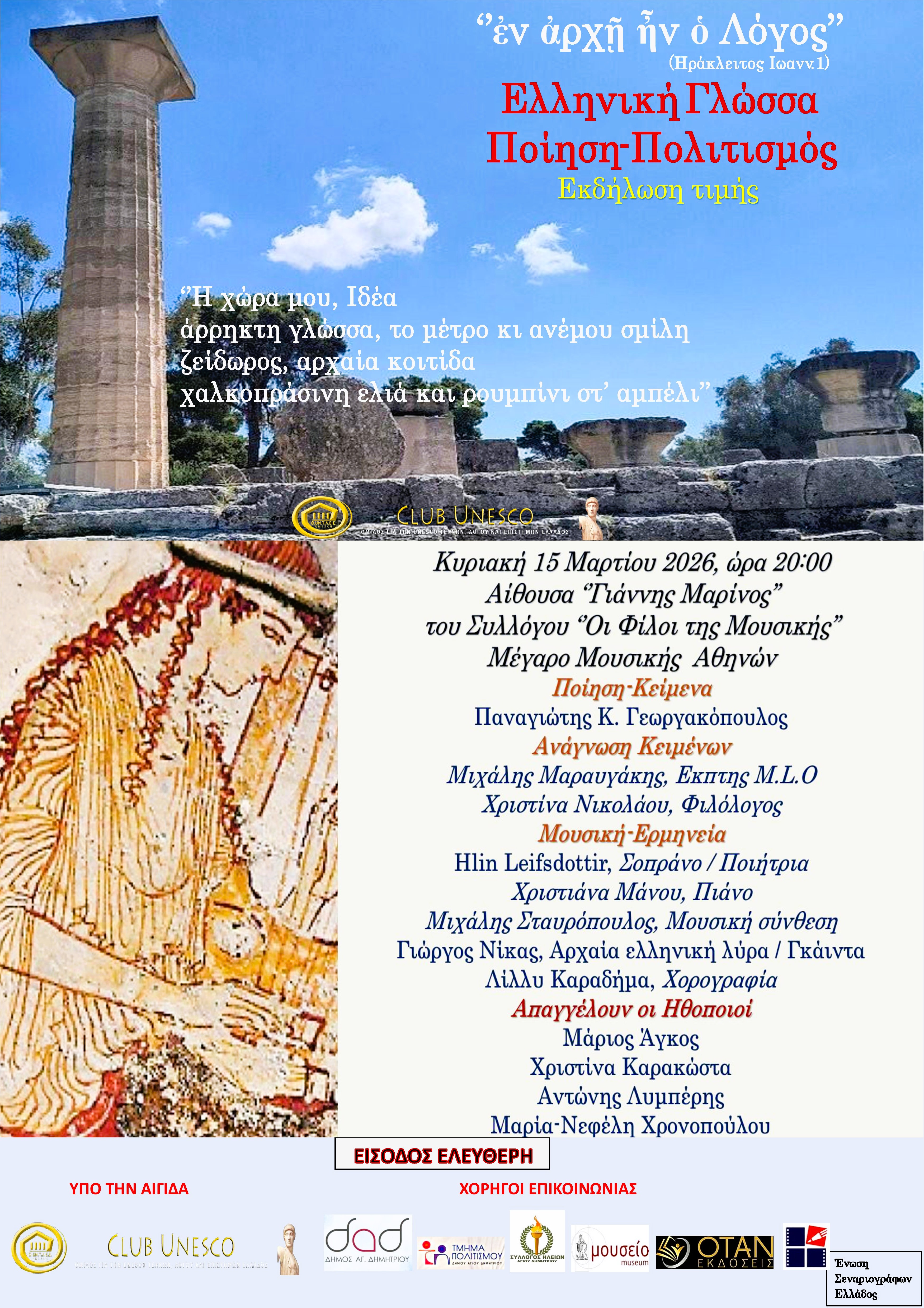 15 Μαρ 2026 / 20:00 Περιγραφή: afisa15.3.26.jpg Χώρος: Αίθουσα Γιάννης ΜαρίνοςΚόστος: Είσοδος ελεύθερη