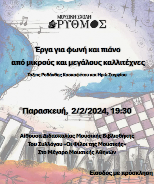 Μουσική συναυλία με έργα για φωνή και πιάνο από τους μαθητές των τάξεων της Ροδάνθης Κασκαφέτου και της Ηρώς Στεργίου της μουσικής σχολής Ρυθμός.