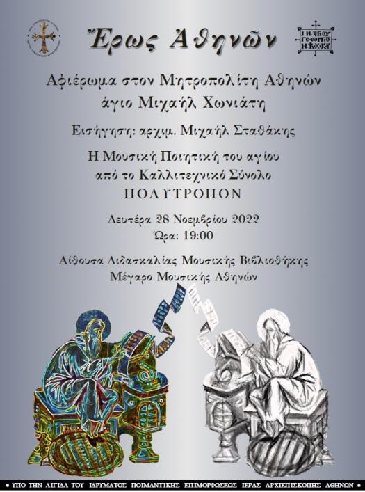 Την Δευτέρα 28 Νοεμβρίου 2022, ώρα 19:00, στην Αίθουσα Διδασκαλίας της Μουσικής Βιβλιοθήκης στο Μέγαρο Μουσικής Αθηνών, θα πραγματοποιηθεί ένα αφιέρωμα στον Μητροπολίτη Αθηνών άγιο Μιχαήλ Χωνιάτη, με τον τίτλο «Ἔρως Ἀθηνῶν».