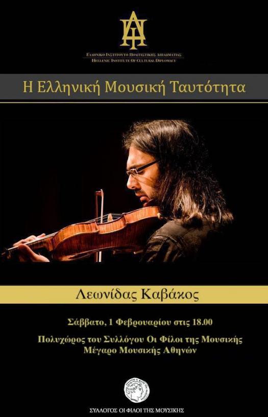 Το Ελληνικό Ινστιτούτο Πολιτιστικής Διπλωματίας έχει την τιμή και τη χαρά να παρουσιάσει στο ελληνικό κοινό τον διεθνούς φήμης βιολονίστα κ. Λεωνίδα Καβάκο, σε μια ενδιαφέρουσα συζήτηση που θα φιλοξενηθεί το Σάββατο 1η Φεβρουαρίου, ώρα 18:00, στον Πολυχώρο του Συλλόγου Οι Φίλοι της Μουσικής, στο Μέγαρο Μουσικής Αθηνών.