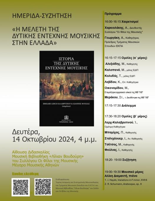 Mε αφορμή την κυκλοφορία του βιβλίου "Ιστορία της Δυτικής Έντεχνης Μουσικής", που επιμελήθηκαν οι Καθηγητές Irmgard Lerch-Καλαβρυτινού & Ιωάννης Φούλιας και εξέδωσε ο εκδοτικός οίκος Παπαγρηγορίου-Νάκας, ο Τομέας Ιστορικής και Συστηματικής Μουσικολογίας του Τμήματος Μουσικών Σπουδών του Ε.Κ.Π.Α. και η Μουσική Βιβλιοθήκη «Λίλιαν Βουδούρη» του Συλλόγου Οι Φίλοι της Μουσικής συνδιοργανώνουν ημερίδα-συζήτηση με θέμα "Η μελέτη της δυτικής έντεχνης μουσικής στην Ελλάδα".