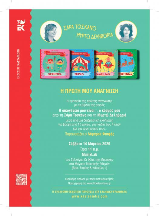 Η εμπειρία της πρώτης ανάγνωσης με τα βιβλία της σειράς Η οικογένειά μου είναι...ο κόσμος μου από τη Σάρα Τοσκάνο και τη Μυρτώ Δεληβοριά μέσα από μία διαδραστική εκδήλωση για βρέφη από 10 μηνών, για παιδιά έως 4 ετών και για τους γονείς τους.