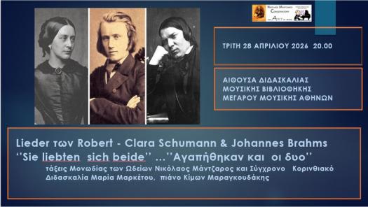 Τα Ωδεία "Νικόλαος Μάντζαρος" & "Σύγχρονο Κορινθιακό Ωδείο" και οι τάξεις Μονωδίας τους παρουσιάζουν στις 8 το βράδυ της 28ης Απριλίου 2026 στην Αίθουσα Διδασκαλίας της Μουσικής Βιβλιοθήκης του Μεγάρου Μουσικής Αθηνών τη συναρπαστική ιστορία των δύο μεγάλων μουσουργών Robert Schumann και Johannes Brahms - μέσα απ' τα υπέροχα Lieder τους - με συνδετικό κρίκο τη διάσημη πιανίστα Clara Schumann, που αγάπησαν κι οι δύο βαθιά και που ανάδειξε και διέδωσε διεθνώς, μέσα απ' τα μαγικά της πλήκτρα τη μουσική τους ιδιοφυΐα.