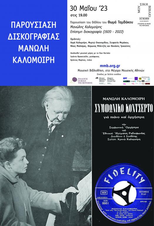 Ο μουσικογράφος, κριτικός, ερευνητής, συγγραφέας και επίτιμο μέλος της Ένωσης Ελλήνων Μουσουργών Θωμάς Ταμβάκος παρουσιάζει τη δισκογραφία του Μανώλη Καλομοίρη, την οποία συνέταξε με αφορμή την επέτειο των 140 χρόνων από τη γέννησή του μεγάλου συνθέτη. Μετά την παρουσίαση, ακολουθεί μουσικό μέρος με το Duo Vocialo, που θα ερμηνεύσει πέντε αδισκογράφητα τραγούδια γiα φωνή και πιάνο του συνθέτη.