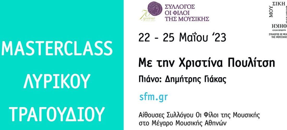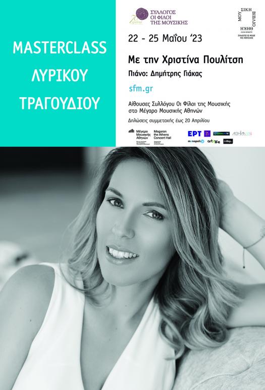Στο πλαίσιο της επετείου των 70 χρόνων από την ίδρυση των Φίλων της Μουσικής, η διεθνούς φήμης σοπράνο και πρώην υπότροφος του Συλλόγου Χριστίνα Πουλίτση προσφέρει ένα Masterclass για νέους λυρικούς καλλιτέχνες ή σπουδαστές, άντρες και γυναίκες, επιπέδου τουλάχιστον Α’ Ανωτέρας. Στο πιάνο, ο εξαιρετικός Δημήτρης Γιάκας. Το σεμινάριο διοργανώνει ο Σύλλογος Οι Φίλοι της Μουσικής και θα διεξαχθεί από τις 22 μέχρι και τις 25 Μαΐου 2023 στους χώρους του Συλλόγου στο Μέγαρο (Αίθουσα Διδασκαλίας και Αίθουσα «Γιάννης Μαρίνος», πρώην Πολυχώρος).