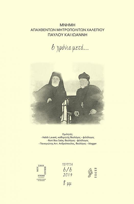 Το Καλλιτεχνικό Σύνολο «Πολύτροπον» (υπεύθυνος: Παναγιώτης Αντ. Ανδριόπουλος) διοργανώνει εκδήλωση μνήμης για τους δύο απαχθέντες Μητροπολίτες Χαλεπίου της Συρίας, τον Ελληνορθόδοξο Μητροπολίτη Παύλο Yazιji και τον Συροϊακωβίτη Ιωάννη Ibrahim, καθώς συμπληρώθηκαν, στις 22 Απριλίου 2019, έξι χρόνια από την απαγωγή τους.