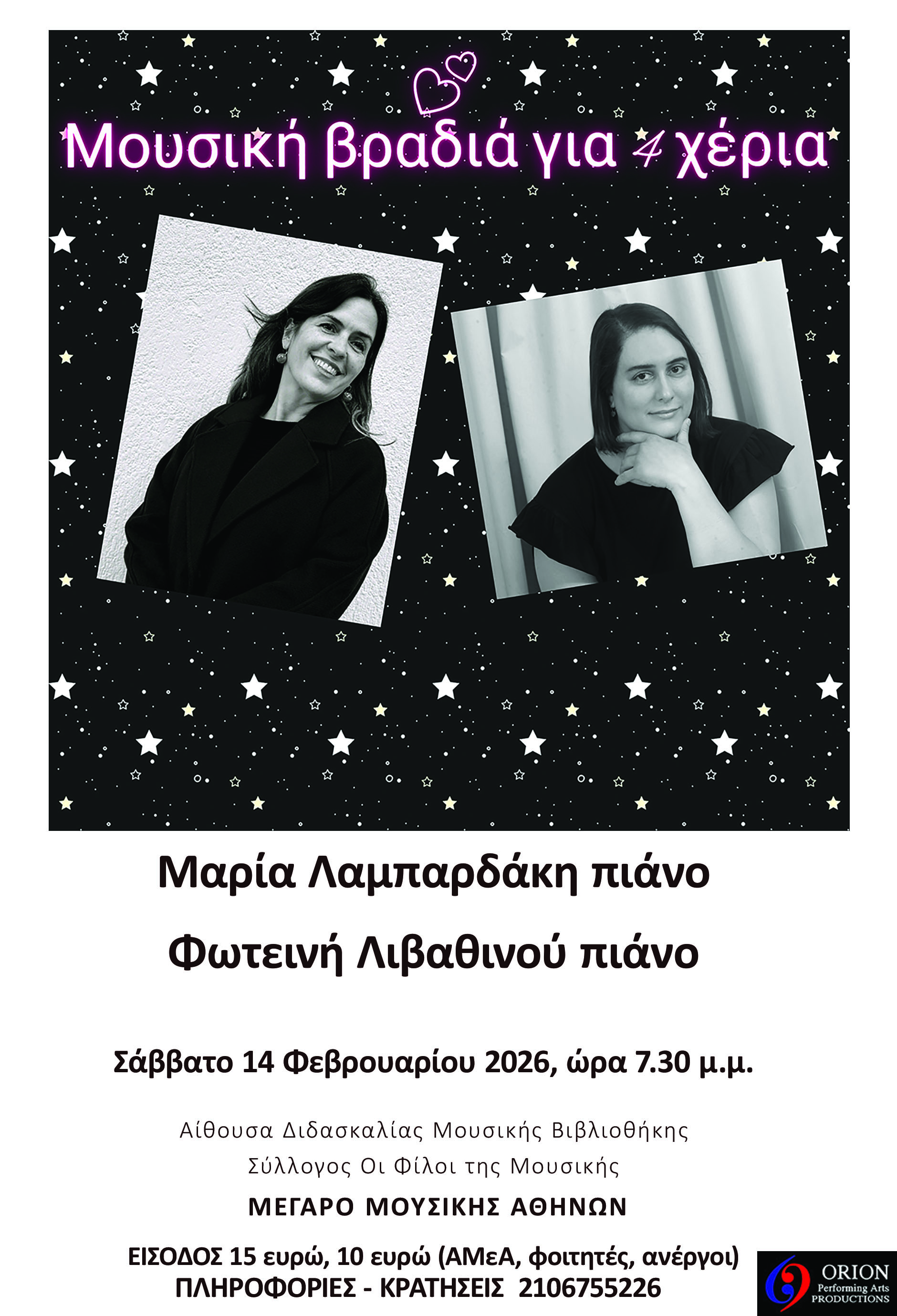 14 Φεβ 2026 / 19:30 Περιγραφή: synavlies_14.2.2026_copy.jpg Χώρος: Αίθουσα ΔιδασκαλίαςΚόστος: Είσοδος με τηλεφωνική κράτηση στο: 210 6755226