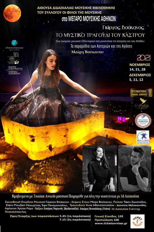 Το πολυβραβευμένο μουσικό παραμύθι του Γιώργου Βούκανου «Το Μυστικό Τραγούδι του Κάστρου – Τα παραμύθια των Αστεριών και της Αγάπης» σε κείμενα Μαίρης Βούκανου θα παρουσιαστεί  για πρώτη φορά στην Αθήνα στο Μέγαρο Μουσικής Αθηνών στην Μουσική Βιβλιοθήκη Λίλιαν Βουδούρη από 14 Νοεμβρίου έως 12 Δεκεμβρίου. Το Μυστικό Τραγούδι του Κάστρου είναι ένα μουσικό οπτικοακουστικό θέαμα που πρωτοπαρουσιάστηκε στο εμβληματικό Κάστρο Χλεμούτσι του Δήμου Ανδραβίδας - Κυλλήνης από το 2018 έως σήμερα, με την υποστήριξη της Περιφέρειας Δυτικής Ελλάδας, και της Εφορείας Αρχαιοτήτων Ηλείας. Από την αρχή του ταξιδιού του το παρακολούθησαν χιλιάδες θεατές στην Ελλάδα και στο εξωτερικό, κατακτώντας μοναδικές διακρίσεις όπως τα Tourism Awards 2020 και τα International Travel Awards 2021, ενώ είναι θεωρείται η πολιτιστική ναυαρχίδα του Διεθνούς Φεστιβάλ του Δήμου Ανδραβίδας - Κυλλήνης και ανήκει στις Μεσαιωνικές Νύχτες Κάστρου. Από το 2019 ανήκει στα European Festivals Association EFFE. Το 2020 παρουσιάστηκε με την Συμφωνική του μορφή από την Ορχήστρα Σύγχρονης Μουσικής της ΕΡΤ, ενώ προβλήθηκε και από την τηλεόραση της ΕΡΤ τον Αύγουστο του 2021 στην Ελλάδα και στο Εξωτερικό. Το αγαπημένο παραμύθι για μικρούς και μεγάλους θα παρουσιαστεί με νέα θεματική και  μουσικά θέματα, μαζί με την χρησιμοποίηση ψηφιακής τεχνολογίας - Video 3d Animation και ατμοσφαιρικούς φωτισμούς.