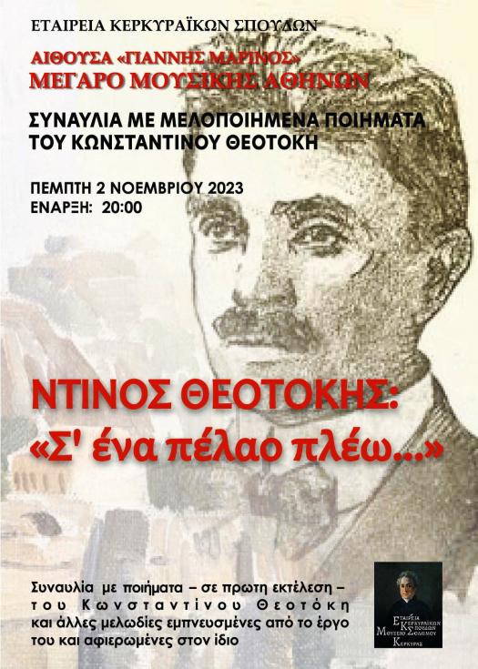 Συναυλία με τίτλο «Ντίνος Θεοτόκης: "Σ'ένα πέλαο πλέω..." για την παρουσίαση – σε πρώτη παγκόσμια εκτέλεση – μελοποιημένων σονέτων του Κερκυραίου συγγραφέα Κωνσταντίνου Θεοτόκη (1872-1923), καθώς και άλλων μελωδιών εμπνευσμένων από το έργο του και αφιερωμένων σε εκείνον, θα πραγματοποιηθεί την Πέμπτη 2 Νοεμβρίου 2023 και ώρα 20:00 στην αίθουσα «Γιάννης Μαρίνος» του Συλλόγου «Οι φίλοι της Μουσικής» στοΜέγαρο Μουσικής Αθηνών.