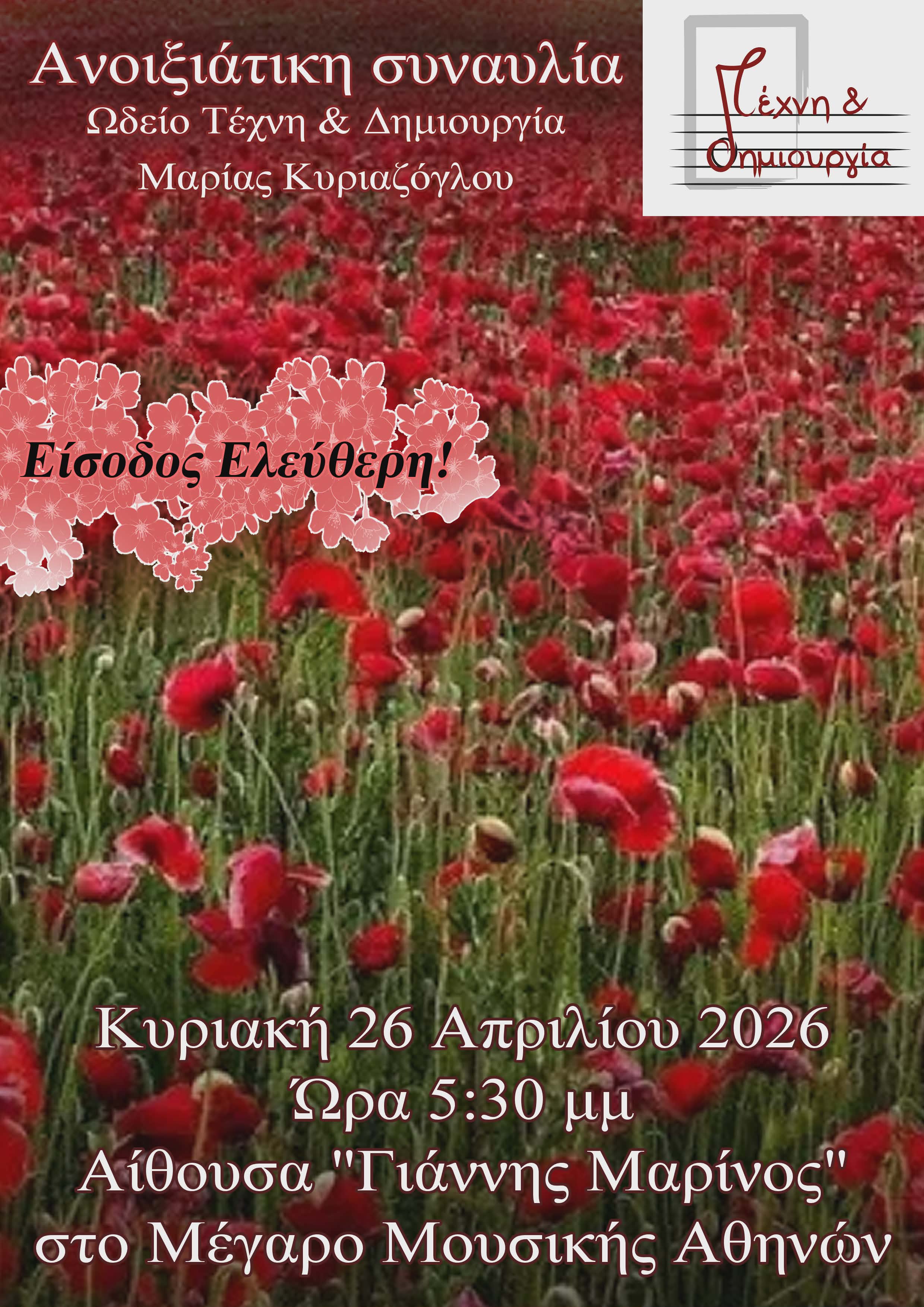 26 Απρ 2026 / 17:30 Περιγραφή: messenger_creation_fa6fd9d4-c035-4419-8d66-28c913cf1183.png Χώρος: Αίθουσα Γιάννης ΜαρίνοςΠαραγωγή: Ωδείο Τέχνη & Δημιουργία Μαρίας Κυριαζόγλου Κόστος: Είσοδος ελεύθερη