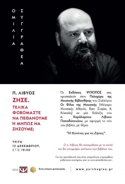 Οι Εκδόσεις ΨΥΧΟΓΙΟΣ σας προσκαλούν την Τρίτη 13 Δεκεμβρίου και ώρα 19.00,  στον Πολυχώρο της Μουσικής Βιβλιοθήκης του Συλλόγου Οι Φίλοι της Μουσικής (Μέγαρο Μουσικής Αθηνών, Βασ. Σοφίας & Κόκκαλη) σε μία διάλεξη του πατέρα Λίβυου, με θέμα "10 κανόνες ζωής" με αφορμή το νέο του βιβλίο. Ο πάτερ θα συνομιλήσει με το κοινό και θα υπογράψει αντίτυπα των βιβλίων του.