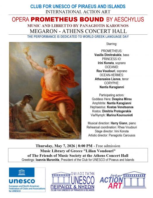 Ο Όμιλος για την UNESCO Πειραιώς και Νήσων και ο Δ.Ο. Interntional Action Art παρουσιαζουν στο Μέγαρο Μουσικής Αθηνών την Πέμπτη 7 Μαΐου 2026, ώρα 20:00, την Όπερα «Προμηθέας Δεσμώτης» του διεθνούς φήμης μουσικοσυνθέτη Παναγιώτη Καρούσου βασισμένη στην ομώνυμη τραγωδία του Αισχύλου.