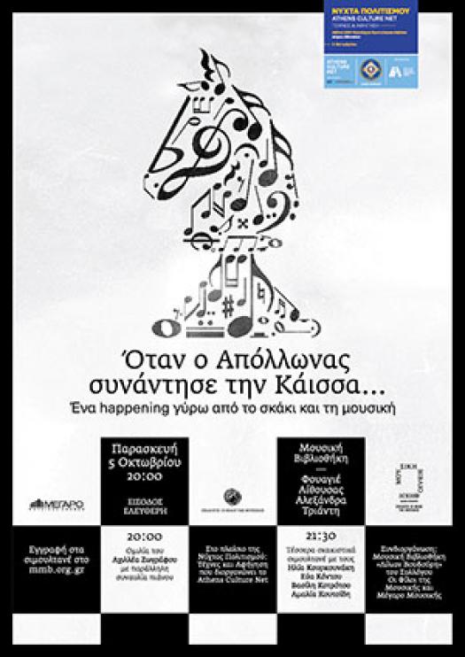 Ένα πρωτότυπο happening γύρω από το σκάκι και τη μουσική, που θα ξεκινήσει στις 20:00 και θα ολοκληρωθεί μετά τα μεσάνυχτα, διοργανώνουν την Παρασκευή 5 Οκτωβρίου η Μουσική Βιβλιοθήκη «Λίλιαν Βουδούρη» του Συλλόγου Οι Φίλοι της Μουσικής και το Μέγαρο Μουσικής Αθηνών.