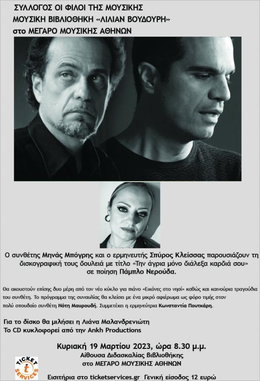 Την Κυριακή 19 Μαρτίου στις 20:30 στη Μουσική Βιβλιοθήκη “Λίλιαν Βουδούρη” του Μεγάρου Μουσικής ο Μηνάς Μπόγρης και η Ankh Productions παρουσιάζουν τη δισκογραφική δουλειά με τίτλο «Την άγρια μόνο διάλεξα καρδιά σου» σε ποίηση Πάμπλο Νερούδα. Τα τραγούδια ερμηνεύει ο Σπύρος Κλείσσας.  Με αφορμή την παρουσίαση του δίσκου του, ο συνθέτης θα ερμηνεύσει επίσης δύο μέρη από το νέο κύκλο του για πιάνο «Εικόνες στο νησί» και θα ακουστούν καινούρια τραγούδια του. Το πρόγραμμα της συναυλίας θα κλείσει με ένα μικρό αφιέρωμα ως φόρο τιμής στον πολύ σπουδαίο συνθέτη Νότη Μαυρουδή. Συμμετέχει η ερμηνεύτρια Κωνσταντία Πουτκάρη