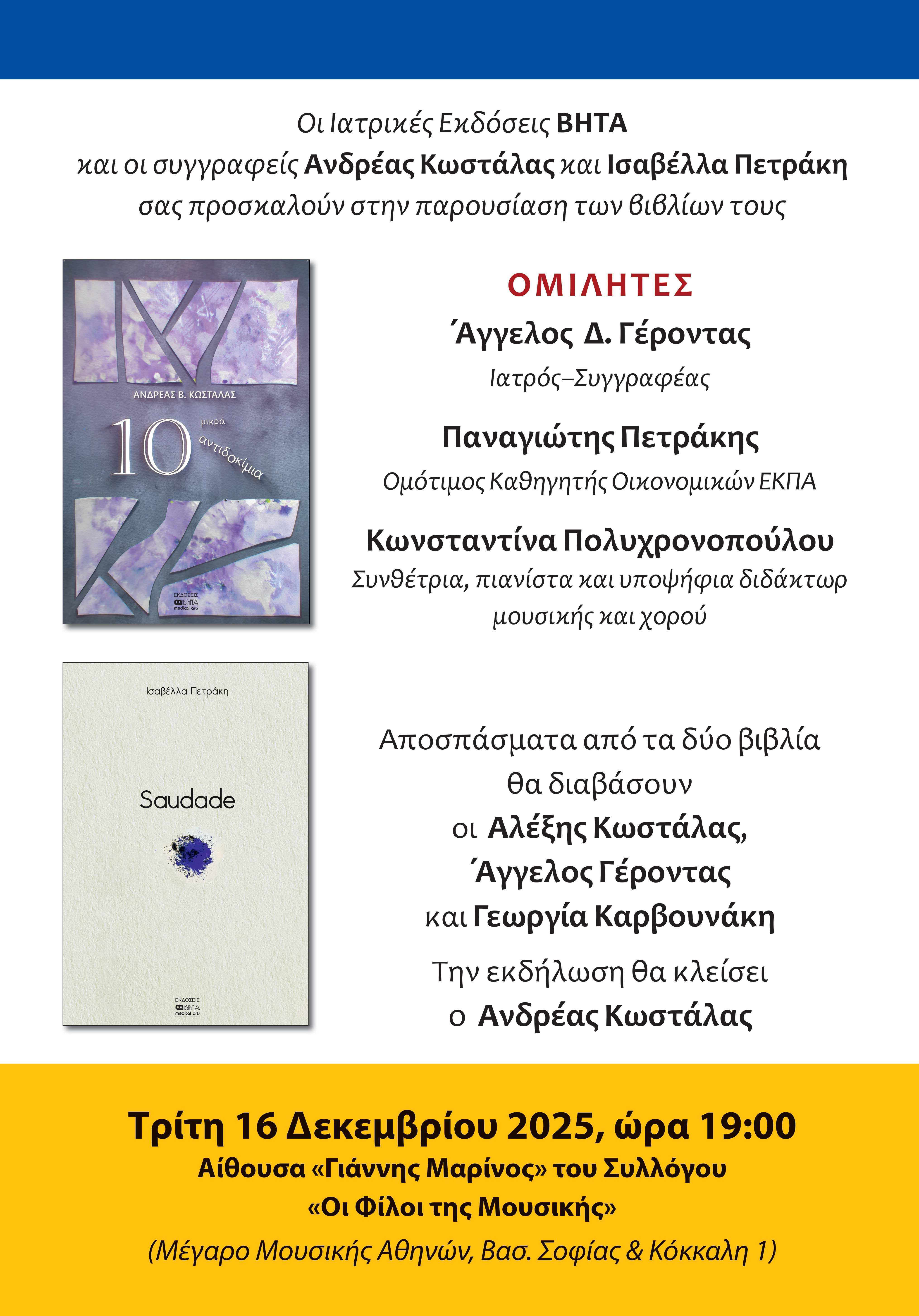 16 Δεκ 2025 / 19:00 Περιγραφή: afisa_kostalas_petraki_dekemvrios_2025_low.jpg Χώρος: Αίθουσα Γιάννης ΜαρίνοςΠαραγωγή: Εκδόσεις ΒΗΤΑ Κόστος: Είσοδος ελεύθερη