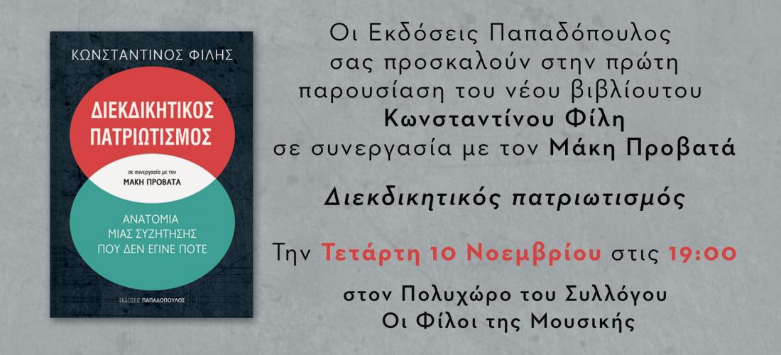 Οι Εκδόσεις Παπαδόπουλος σας προσκαλούν στην πρώτη παρουσίαση του νέου βιβλίου του Κωνσταντίνου Φίλη σε συνεργασία με τον Μάκη Προβατά Διεκδικητικός πατριωτισμός