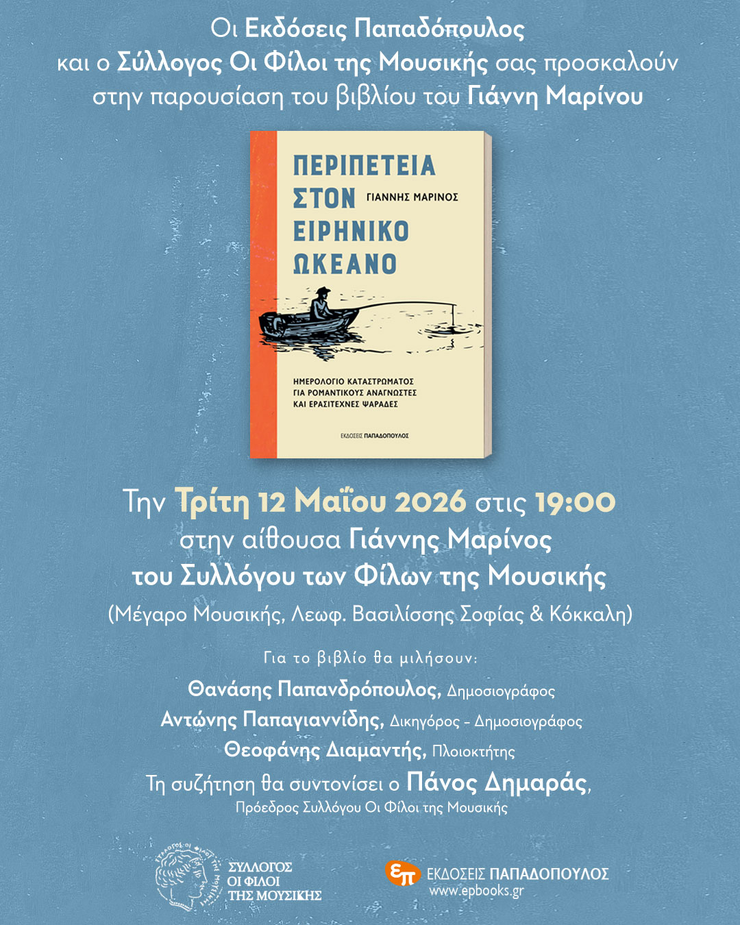 12 Μάι 2026 / 19:00 Περιγραφή: peripeteia-ston-eirhniko-megaro-1080x1350.jpg Χώρος: Αίθουσα Γιάννης ΜαρίνοςΚόστος: Είσοδος ελεύθερη