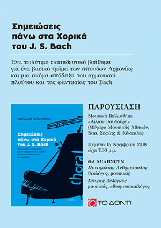 Την Πέμπτη 15 Νοεμβρίου 2018 ώρα 7.00 μ.μ., παρουσιάζεται στην Αίθουσα Διδασκαλίας της Μουσικής Βιβλιοθήκης «Λίλιαν Βουδούρη» το βιβλίο της Βάσως Φιλιππαίου «Σημειώσεις πάνω στα Χορικά του J. S. Bach», Εκδόσεις "Το Δόντι".