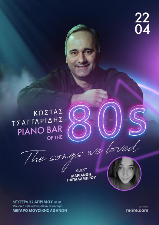 Βυθιστείτε στις νοσταλγικές δονήσεις των 80s με μια αποκλειστική βραδιά piano-bar με τον πιανίστα-τραγουδιστή, Κώστα Τσαγγαρίδη, που υπόσχεται να γεφυρώσει το χάσμα ανάμεσα στο χθες και το σήμερα, τη νοσταλγία και τις νέες ανακαλύψεις, τη Δευτέρα 22 Απριλίου και ώρα 20:30 στη Μουσική Βιβλιοθήκη «Λίλιαν Βουδούρη», Μέγαρο Μουσικής Αθηνών.