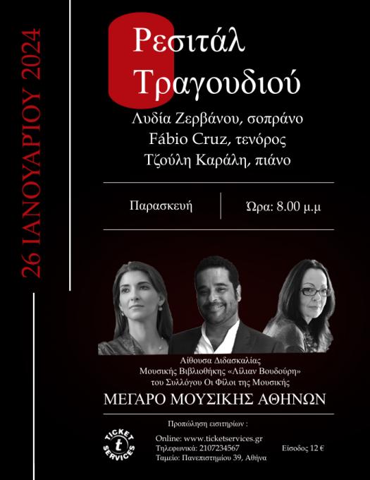 Η σοπράνο Λυδία Ζερβάνου και ο τενόρος Fábio Cruz με τη συνοδεία της Τζούλης Καράλη στο πιάνο, στη δεύτερη καλλιτεχνική σύμπραξή τους παρουσιάζουν ένα πρόγραμμα με άριες και ντουέτα από την όπερα, καθώς και τη βιεννέζικη, την ελληνική και την ισπανική οπερέτα.