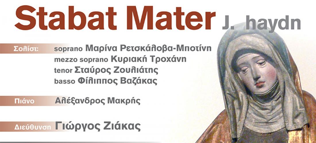 Το εκφραστικότατο έργο, ύμνο στην Παρθένο Μαρία, ‘’STABAT MATER ‘’, με δεκατρία μέρη, για σολίστ, χορωδία και πιάνο, του Josef Haydn [ Rohrau 1732- Vienna 1809 ], θα ερμηνεύσει, σε διδασκαλία Γεωργίου Ζιάκα, η μεικτή χορωδία ‘’ Μελωδοί‘’, την Δευτέρα 26 Μαρτίου 2018, στον Πολυχώρο του Συλλόγου Οι Φίλοι της Μουσικής , στο Μέγαρο Μουσικής Αθηνών..