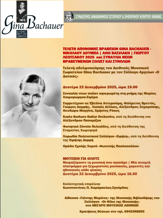 Το Διεθνές Μουσικό Σωματείο Gina Bachauer και ο Σύνδεσμος Αναβάθμισης Ιστορικού & Εμπορικού Κέντρου της Αθήνας, έχουν την τιμή να σας προσκαλέσουν στην Τελετή Απονομής των Βραβείων «Gina Bachauer-Νικολάου Δούμπα», «Άθω Βασιλάκη» και «Γιώργου Λεωτσάκου», στην Τελετή αδελφοποίησης του Διεθνούς Μουσικού Σωματείου Gina Bachauer με τον Σύλλογο Αργείων «Ο Δαναός» και στη Συναυλία Νέων Βραβευμένων Σολίστ και Συνόλων.