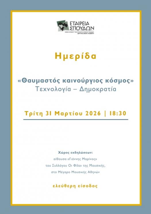 Η Εταιρεία Σπουδών Ν.Π. & Γ.Π. (ιδρυτής Σχολή Μωραΐτη) σας προσκαλεί στην εκδήλωση που διοργανώνει με τίτλο «“Θαυμαστός καινούργιος κόσμος”. Τεχνολογία - Δημοκρατία», την Τρίτη 31 Μαρτίου 2026 και ώρα 18:30, στην αίθουσα «Γιάννης Μαρίνος» του Συλλόγου Οι Φίλοι της Μουσικής στο Μέγαρο Μουσικής Αθηνών.