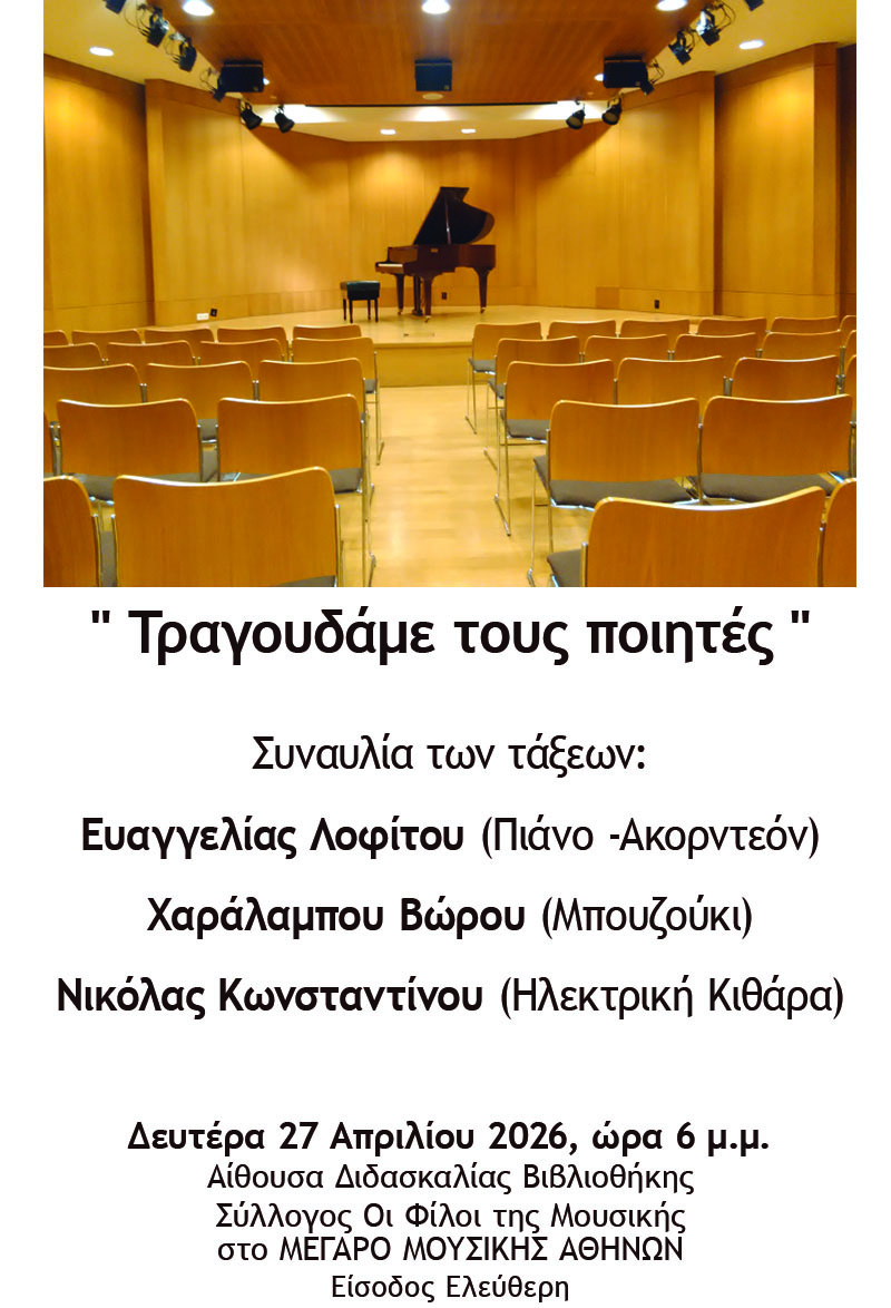 27 Απρ 2026 / 18:00 Περιγραφή: synavlies_27_4_2026lofitoy_copy.jpg Χώρος: Αίθουσα ΔιδασκαλίαςΚόστος: Είσοδος ελεύθερη
