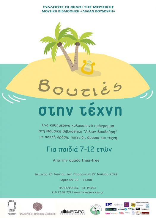 Η Μουσική Βιβλιοθήκη «Λίλιαν Βουδούρη», σε συνεργασία με την ομάδα thea-tree, διοργανώνει ένα πρόγραμμα με πολλή δράση, παιχνίδι, δροσιά και φυσικά … τέχνη! Παιδιά, παιδαγωγοί και καλλιτέχνες «βουτούν στην τέχνη» καθημερινά από τις 9 το πρωί ως τις 4 το μεσημέρι. Ανάμεσα στις δράσεις ξεκουράζονται με μια βόλτα για δεκατιανό στον κήπο και αργότερα με γεύμα στο αίθριο του Μεγάρου Μουσικής. Τα παιδιά χωρισμένα σε ομάδες παίζουν με τη μουσική, το θέατρο, το χορό και τα εικαστικά δημιουργώντας στο τέλος κάθε εβδομάδας μια παράσταση με πειρατές, σειρήνες, γοργόνες και δράκους.