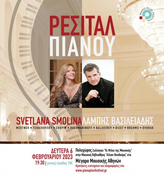 Πρόκειται για την επιστροφή στην Ελλάδα της δεξιοτέχνιδας και πολυβραβευμένης πιανίστα Svetlana Smolina που είχαμε την ευκαιρία να απολαύσουμε στο πλαίσιο του Διεθνούς Φεστιβάλ Κέρκυρας (2005-2011). Την “Sveta” συνοδεύει με μια παράλληλη παρουσίαση ο καθηγητής του Τμήματος Μουσικών Σπουδών του Ιονίου Πανεπιστημίου, πιανίστας Λάμπης Βασιλειάδης. Οι δυο καλλιτέχνες συνδέονται με μακρά φιλία που δεν περιορίζεται στην ανθρώπινη σχέση αλλά αποτυπώνεται κυρίως στην ερμηνευτική τους σχολή: η Svetlana Smolina μαθήτευσε κοντά στον Alexander Toradze, o Λάμπης Βασιλειάδης κοντά στον Viktor Karpovich Merzhanov. Με έργα των Frédéric Chopin, Piotr Ilitch Tchaikovsky, Sergei Rachmainonff, Nikolai Medtner, Mily Balakirev και George Bizet, τα 2+2 χέρια θα γίνουν 4 όταν στο τέλος του διπλού ρεσιτάλ οι πιανίστες θα παίξουν μαζί έργα των Johannes Brahms και Antonin Dvorak.