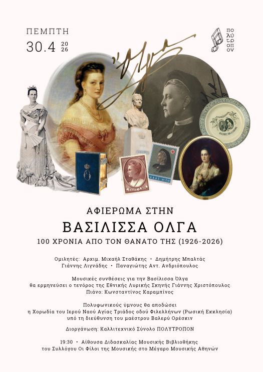 Το Καλλιτεχνικό Σύνολο «Πολύτροπον» (υπεύθυνος: Παναγιώτης Αντ. Ανδριόπουλος), παρουσιάζει ένα αφιέρωμα στην Βασίλισσα των Ελλήνων Όλγα, με αφορμή την επέτειο των 100 χρόνων από τον θάνατό της, την Πέμπτη 30 Απριλίου 2026, 7.30 μ.μ. στην Αίθουσα Διδασκαλίας της Μουσικής Βιβλιοθήκης του Συλλόγου Οι Φίλοι της Μουσικής στο Μέγαρο Μουσικής Αθηνών.