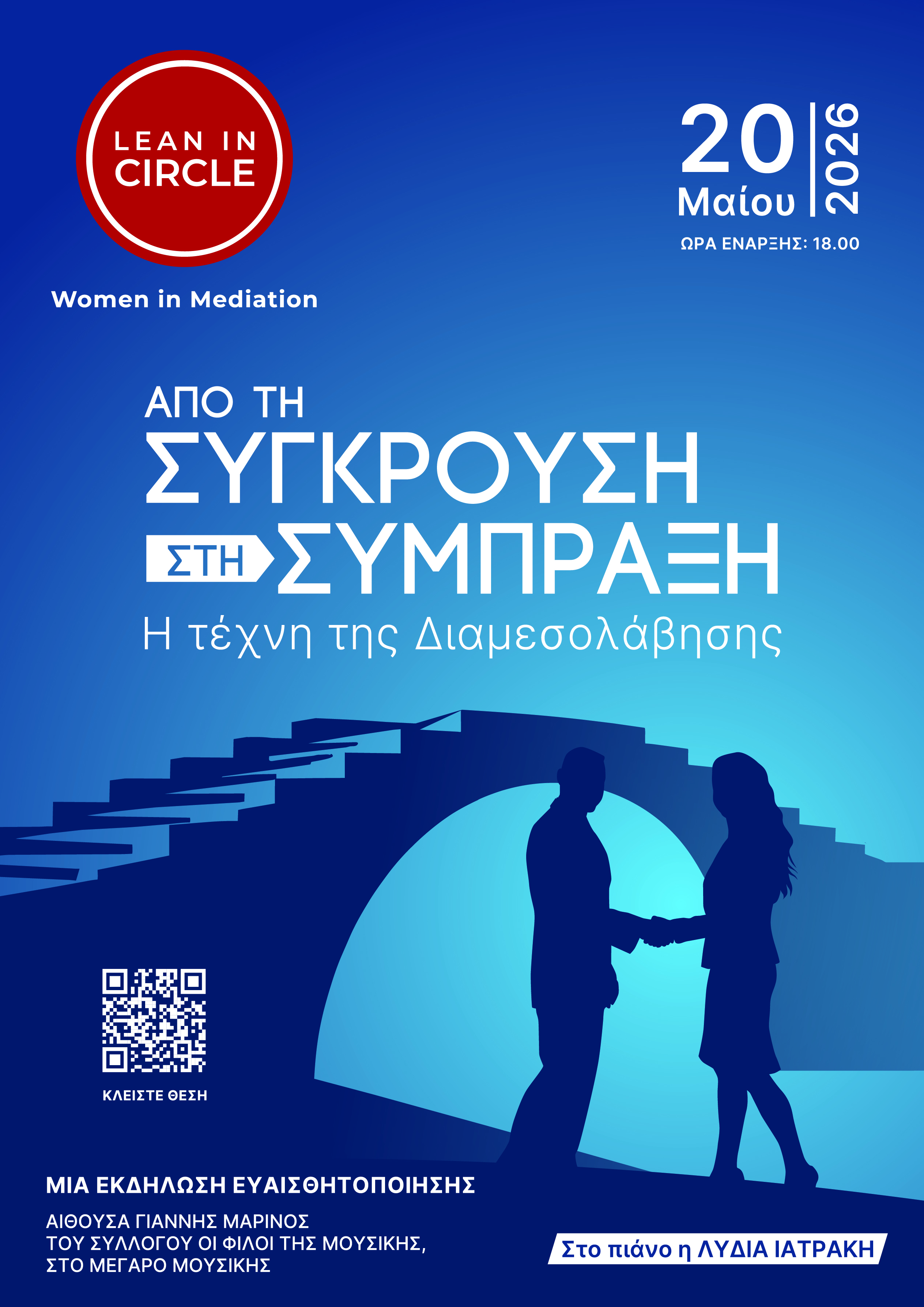 20 May 2026 / 18:00 Description: lean_in_mediation_poster_final_qr.jpg Venue: Giannis Marinos HallCost: Είσοδος με κράτηση μέσω του QR
