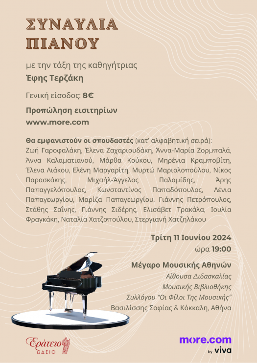 Την Τρίτη 11 Ιουνίου 2024, θα έχουμε τη χαρά να απολαύσουμε τους μικρούς και μεγάλους σπουδαστές από την τάξη πιάνου της καθηγήτριας του Εράτειου Ωδείου Έφης Τερζάκη, σε μια συναυλία που φιλοξενείται στη Μουσική Βιβλιοθήκη του Συλλόγου “Οι Φίλοι της Μουσικής” στο Μέγαρο Μουσικής Αθηνών και συγκεκριμένα στην Αίθουσα Διδασκαλίας.