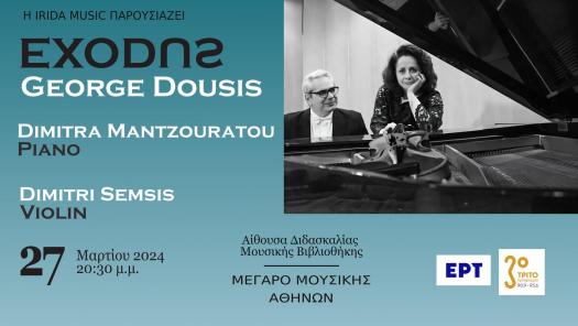 Ο συνθέτης Γιώργος Δούσης παρουσιάζει το δίσκο EXODUS που περιλαμβάνει δύο έργα για σόλο πιάνο και ένα για βιολί και πιάνο. Πρόκειται για μια σκιαγράφηση της συνθετικής πορείας του συνθέτη όπως αυτή διαμορφώθηκε κατά την δεκαετία 2010-2020.