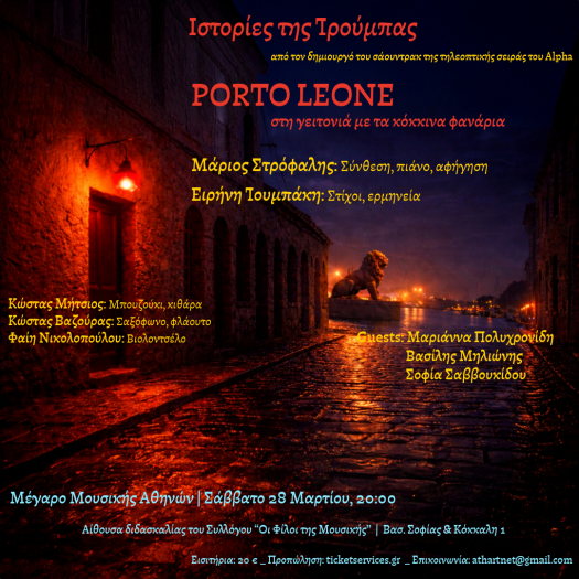 Μια βραδιά γεμάτη από τον μουσικό ήχο της σειράς "Porto Leone" που έντυσε τα πάθη, τους έρωτες και τις σκιές του λιμανιού, μέσα από τις νότες του Μάριου Στρόφαλη και τους στίχους της Ειρήνης Τουμπάκη, μαζί με αληθινές ιστορίες της Τρούμπας.