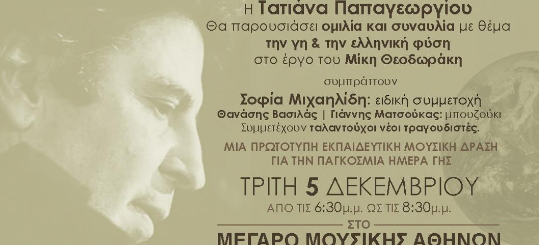 Η φυσιολατρία του Μίκη Θεοδωράκη αποτυπώνεται ευρύτατα στο έργο του. Ενδεικτικά αναφέρουμε έργα του με τίτλους όπως : "To Τραγούδι της Γης", "Χρυσοπράσινο Φύλλο", "Πράσινη Μέρα" (από τον κύκλο Λιανοτράγουδα), «Ροδιά», «Μυρτιά», « Τα θεμέλια μου στα Βουνά», «Σε ποιο Βουνό», «Μενεξεδένια ήταν τα Βουνά» και πολλά άλλα που θα αξιοποιηθούν για την εκπαιδευτική δράση και θα παρουσιαστούν στην εκδήλωση.