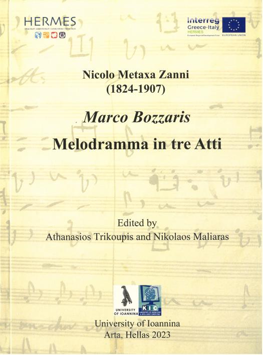 H κριτική έκδοση της όπερας του Νικολάου Μεταξά-Τζαννή (1824-1907) Μάρκος Μπότσαρης, που επιμελήθηκαν οι Αθανάσιος Τρικούπης (Αναπλ. Καθηγητής του Πανεπιστημίου Ιωαννίνων) και Νικόλαος Μαλιάρας (Καθηγητής του Πανεπιστημίου Αθηνών) παρουσιάζεται την Τετάρτη 20 Μαρτίου και ώρα 7.00 μ.μ στην Αίθουσα Γιάννης Μαρίνος (πρώην Πολυχώρος) της Μουσικής Βιβλιοθήκης στο Μέγαρο Μουσικής Αθηνών.