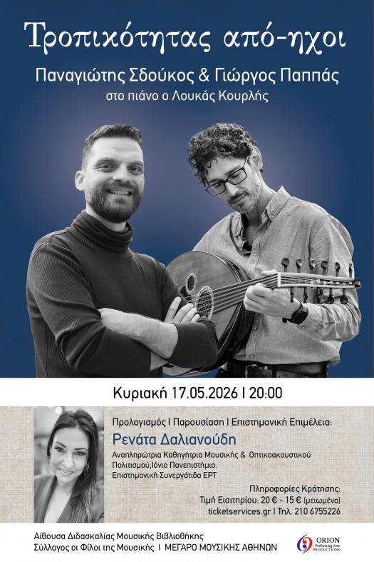 Τροπικότητας από-ηχοι Παναγιώτης Σδούκος & Γιώργος Παππάς Το project «τροπικότητας από-ηχοι» είναι ένα δημιουργικό εγχείρημα δυο καταξιωμένων καλλιτεχνών στον χώρο της έρευνας, της διδασκαλίας και της επιτέλεσης της ελληνικής παραδοσιακής μουσικής, καθώς και των οικείων μουσικών παραδόσεων της ευρύτερης λεκάνης της Ανατολικής Μεσογείου: του μουσικού (MA) στις Επιστήμες και Τέχνες της Μουσικής, Γιώργου Παππά και του ερμηνευτή και υπ. Διδάκτορα στις λαϊκές παραστατικές τέχνες, Παναγιώτη Σδούκου.