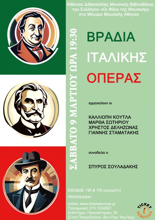 Ένα μουσικό αφιέρωμα στην ιταλική όπερα από την εποχή του μπελκάντο του 19ου αιώνα μέχρι τον βερισμό, μέσα από γνωστές άριες και ντουέτι μερικών από τους κύριους εκπροσώπους της (Rossini, Verdi, Puccini, Leoncavallo και Mascagni).