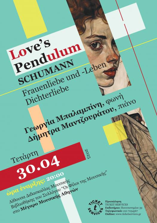 Στις 30 Απριλίου στις 20:00 στην Αίθουσα Διδασκαλίας της Μουσικής Βιβλιοθήκης του Συλλόγου οι Φίλοι της Μουσικής του Μεγάρου Μουσικής Αθηνών, η υψίφωνος Γεωργία Μπαλαμπίνη, με εξειδίκευση στα Lieder και η δεξιοτέχνης πιανίστα Δήμητρα Μαντζουράτου θα παρουσιάσουν τους δυο κύκλους τραγουδιών του Robert Schumann, Frauenliebe und Leben opus 42 & Dichterliebe opus 48 με το γενικό τίτλο Love’s Pendulum.