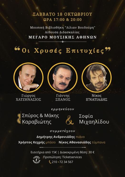 Οι σύγχρονοι τροβαδούροι της αγάπης, οι αδελφοί Σπύρος & Μάκης Καραβιώτης, μαζί με την καταξιωμένη ερμηνεύτρια Σοφία Μιχαηλίδου, παρουσιάζουν το Σάββατο 18 Οκτωβρίου στο Μέγαρο Μουσικής Αθηνών μια βραδιά γεμάτη συγκίνηση και μελωδίες που σημάδεψαν το ελληνικό τραγούδι. Στο αφιέρωμα «Οι Χρυσές Επιτυχίες», τρεις κορυφαίοι δημιουργοί - Γιώργος Χατζηνάσιος, Γιάννης Σπανός και Νίκος Ιγνατιάδης - τιμώνται μέσα από τα τραγούδια τους, που εξακολουθούν να συγκινούν και να εμπνέουν.